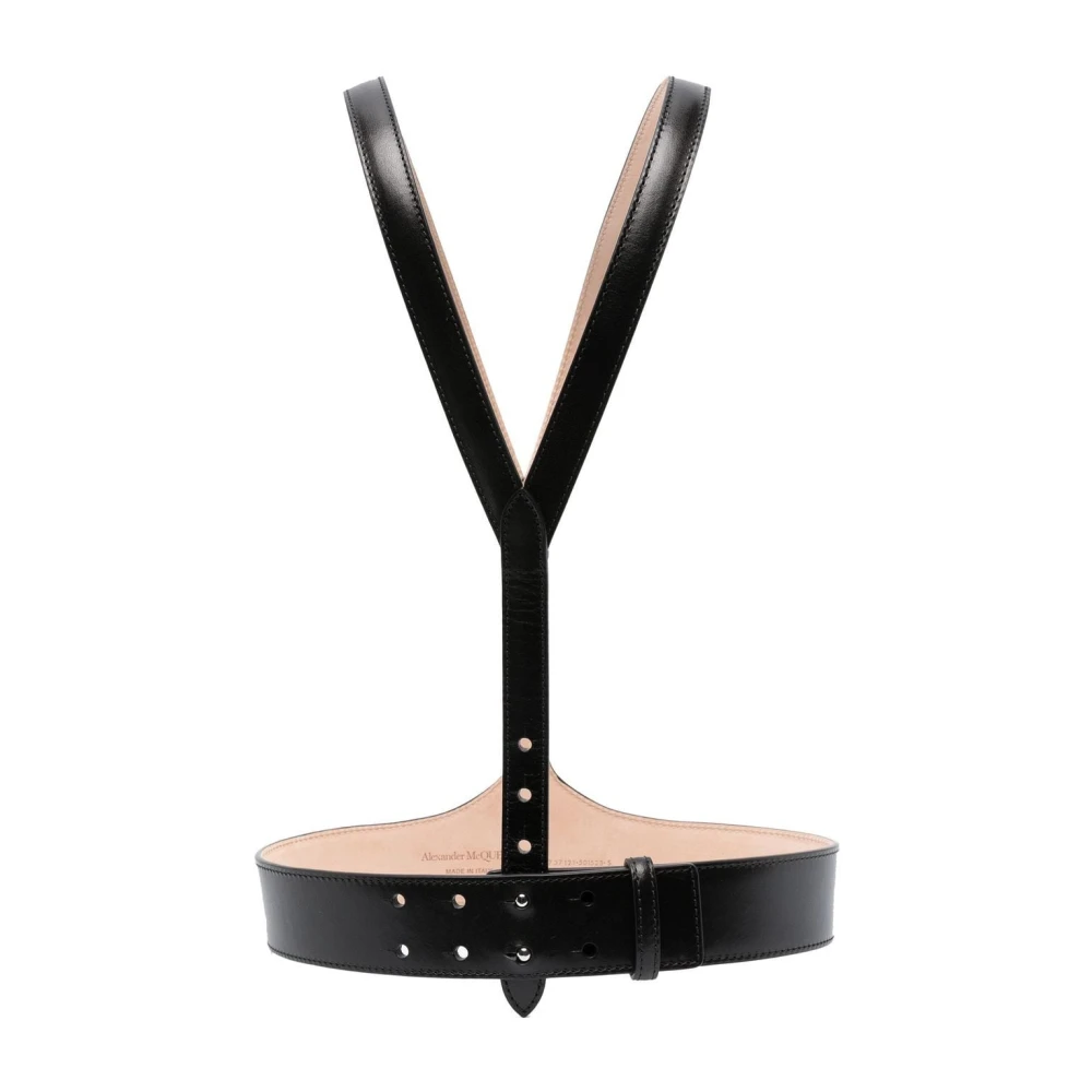 Oppgrader tilbehørsspillet ditt med disse Alexander McQueen Casual svarte skinnbuksene. Det Y-formede designet har en logo-embosset stropp, punch-hole detaljer og justerbare skulderstropper for en behagelig passform. Laget av 100% kalveskinn, er disse buk
