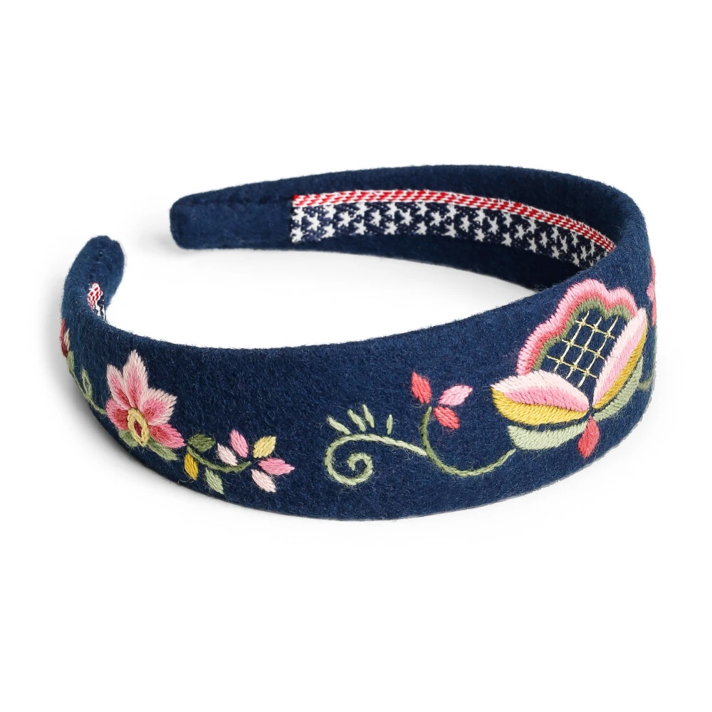 Blå hårbøyle til Lundebybunaden. Håndbrodert i ullstoff.