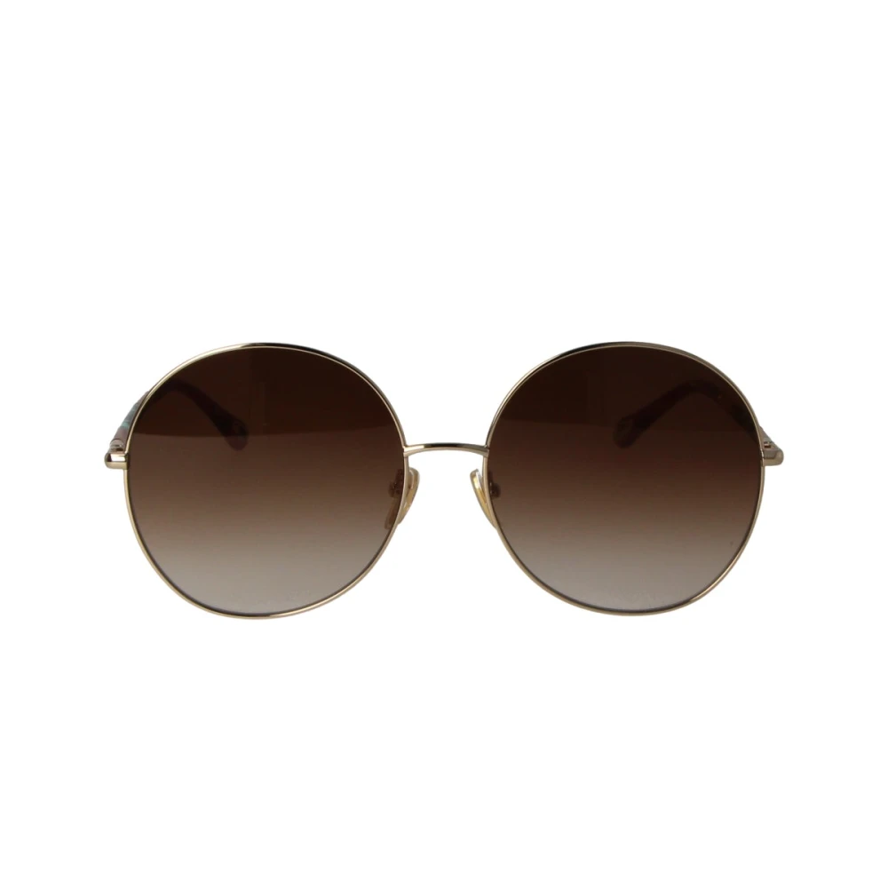 Introduserer Sungles av Chloé, det perfekte tilbehøret for enhver motebevisst kvinne. Disse solbrillene har en rund/oval form og er laget av høykvalitets metallmateriale i en vakker gullfarge. Chloé-logoen er tydelig synlig på rammen, noe som legger til en touch av luksus til utseendet ditt.