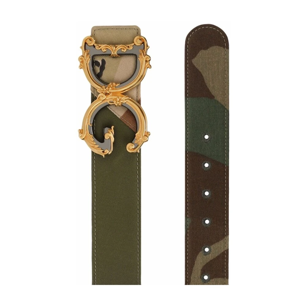 Legg til en touch av luksus til antrekket ditt med denne Dolce Gabbana belt. Laget av grønt og brunt kalveskinn, har den en unik kamuflasje barokk-logo spenne og gullfarget hardware. Den justerbare passformen og hullene sikrer en behagelig og sikker passform.