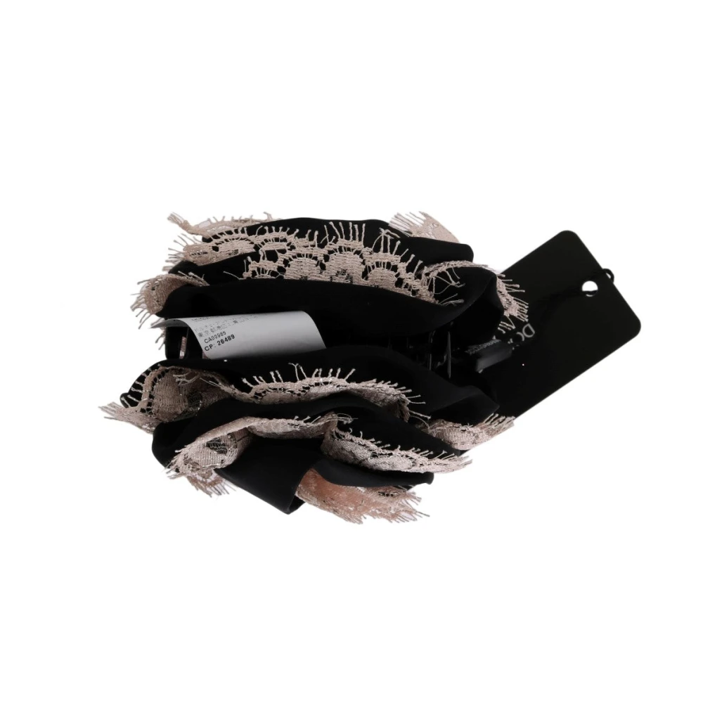 Legg til en touch av eleganse til håret ditt med denne fantastiske Dolce Gabbana hårkloen. Laget av en luksuriøs blanding av silke, rayon, acetat, nylon, polyester og elastan, er dette svarte og rosa blomster blonde hårtilbehøret både stilig og praktisk. Kloen måler 10cm x 10cm og har det ikoniske DG-logoet. Laget i Italia, er denne hårkloen 100% autentisk og helt ny med merkelapper.