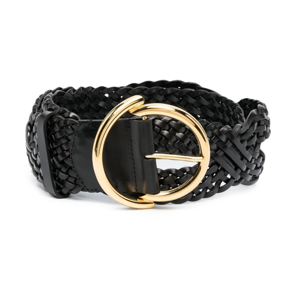 Svart vevd belte fra Etro. Denne gjenstanden er laget av kalveskinn, og fester med en rund metallspenne med en gravert logo i gulltonen.