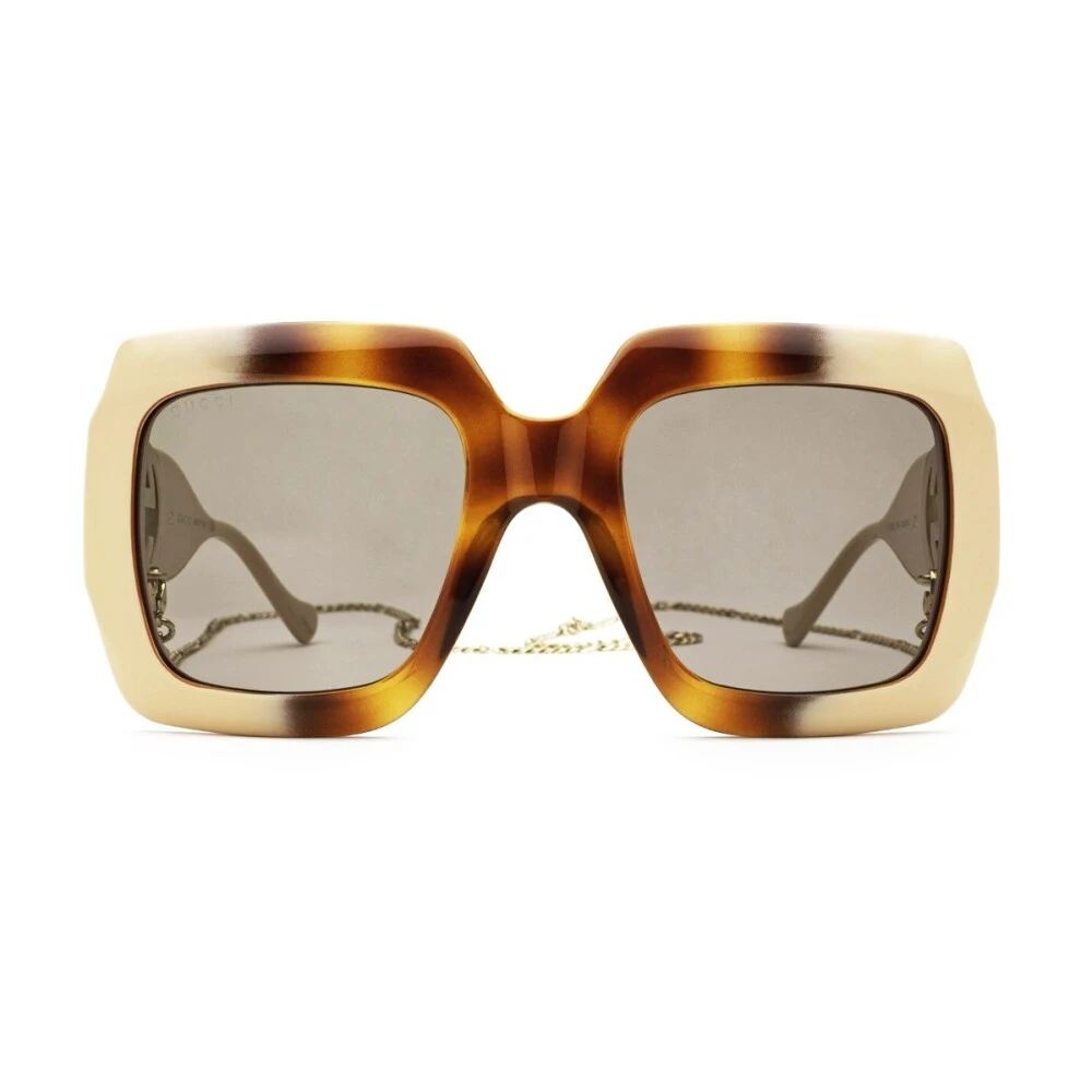 Forbedre stilen din med disse Gucci Logo Solbrillene med Kjede. Det gyldne metalllogoet på sidene legger til en touch av luksus til de brune gl-linsene. Den avtakbare kjeden legger til allsidighet til dette tilbehøret. Acetatmaterialet sikrer holdbarhet. Linsebredde: 5,4 cm, Bro: 2,3 cm, Stamme lengde: 14 cm. Produkttype ID: GG1022S-003.