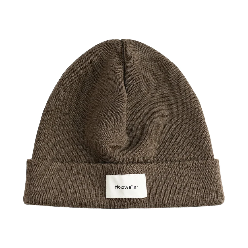 Brun lue fra Holzweiler, med brettekant og hvit merke i sateng, med sort logo. 100% merinoull.