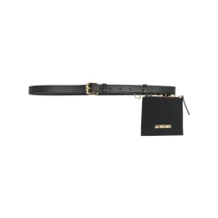 Oppgrader tilbehøret ditt med denne svarte lærbelteposen fra Jacquemus. Den justerbare passformen og spennen gjør den til et allsidig tillegg til ethvert antrekk, mens den avtakbare posen og gullfargede logo-bokstavene legger til en touch av luksus. Laget av 100% kalveskinn, er dette beltet både stilig og holdbart. Designer ID: 223AC307 3060 990.
