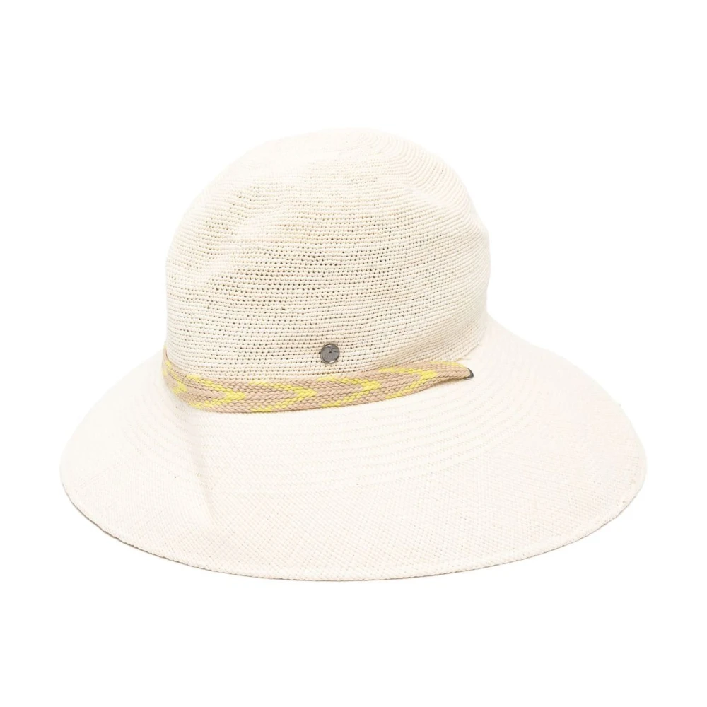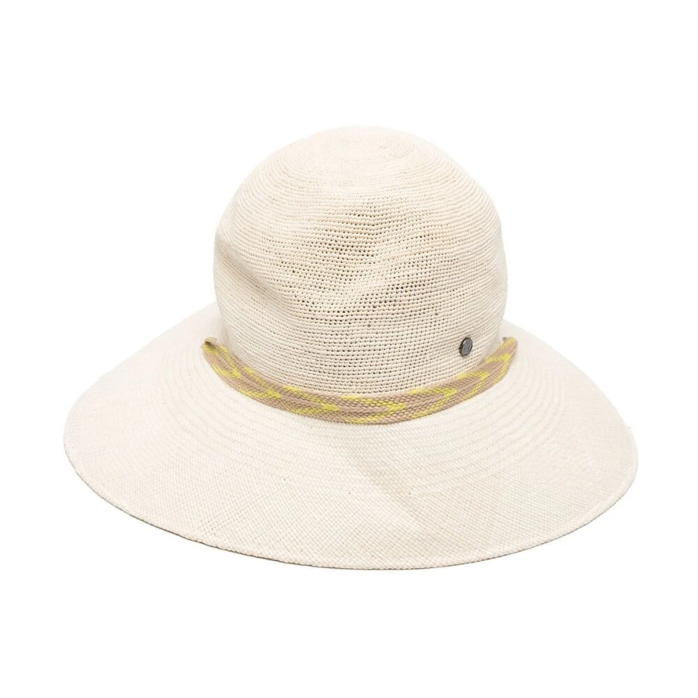 Maison Michel Hats Beige White resirkulerte polyester blonder-detaljerte solhatt fra Maison Michel med blonderdetaljer og buet bred rand.Denne beskrivelsen er automatisk oversatt.
