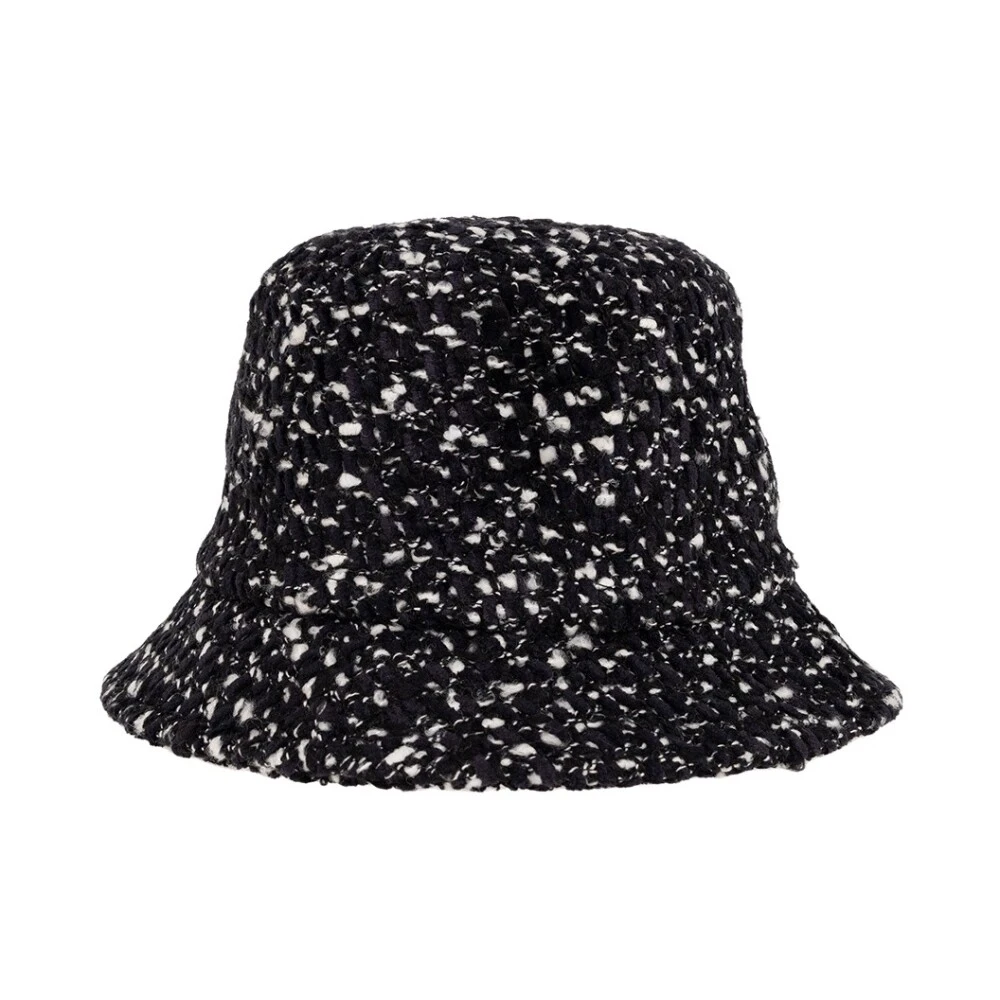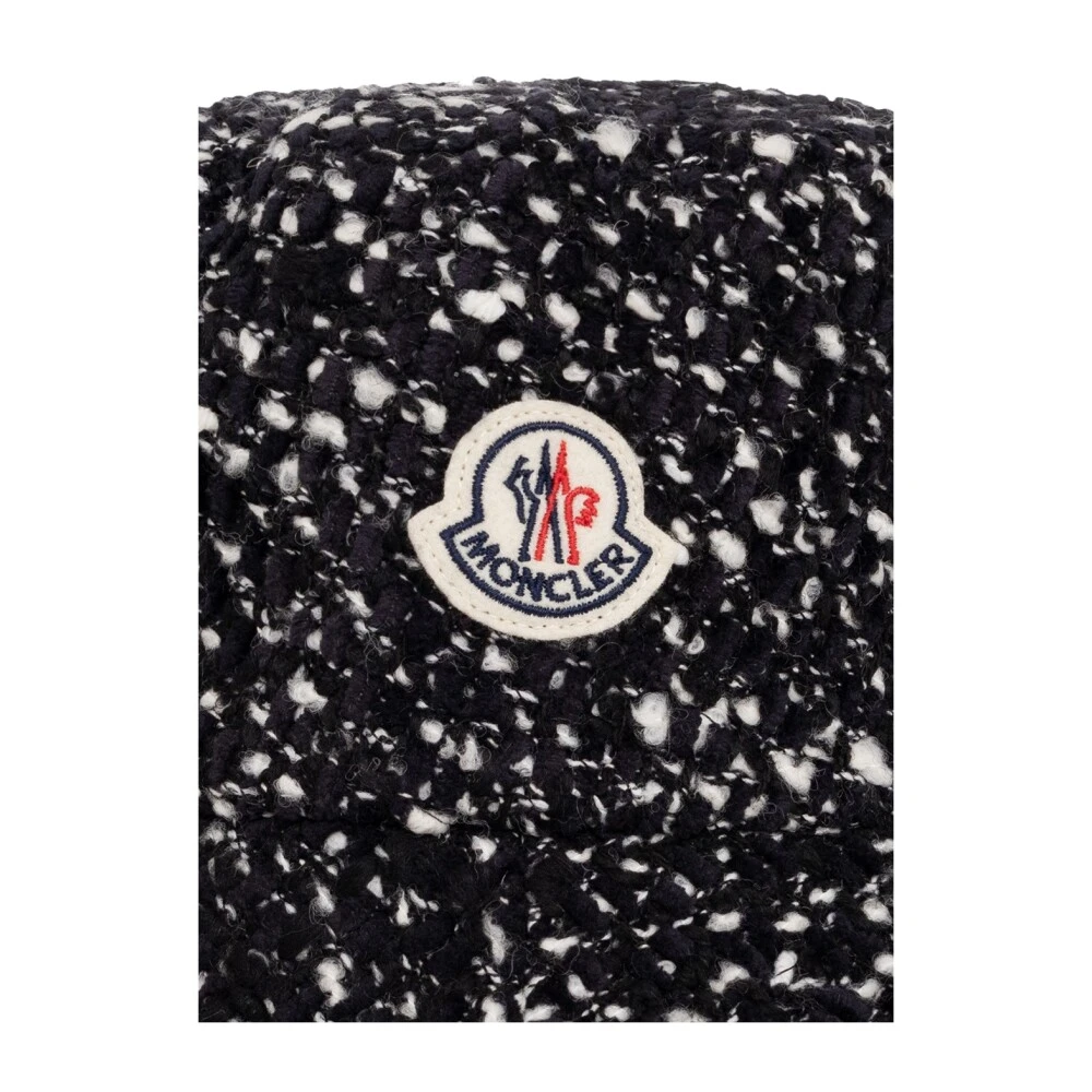 Svart og hvit bøttehatt fra Moncler. Laget av en ullblanding, er denne gjenstanden dekorert med en logolapp i krem, marine og rødt.