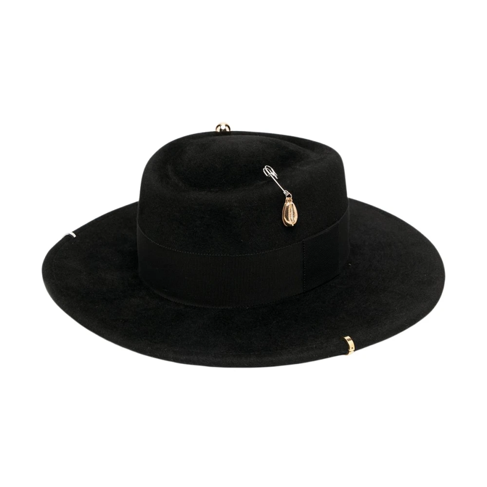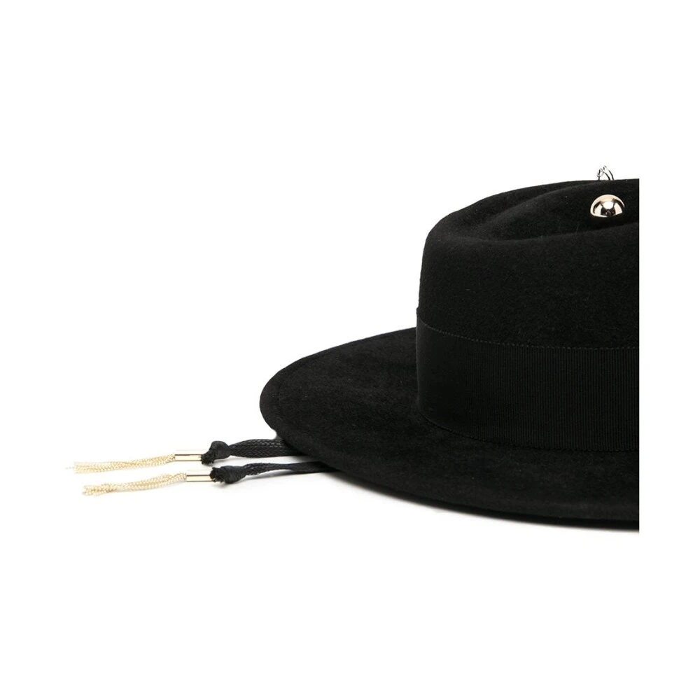 Ruslan Baginskiy Hats Black Black Wool Chain Strap Felt Canotier Hat fra Ruslan Baginskiy med bred rand, drapert stroppdetaljer, konkav krone, sjarmdetalj og maskinvare med blandet metall.