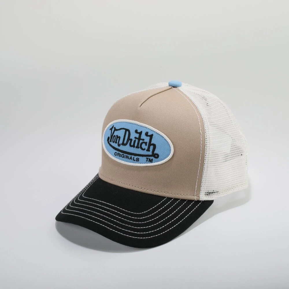 Trucker Boston fra Von Dutch. De ikoniske capsene fra Von Dutch er tilbake. Trucker Boston er en klassisk trucker caps med pustende mesh bak og stor, brodert logopatch i front. Capsen har hvit netting, blå brodert logo og beige stoff med sort brem, og regulerbar størrelse. – Von Dutch logopatch- Pustende mesh bak- Buet brem- Justerbart panel- One Size