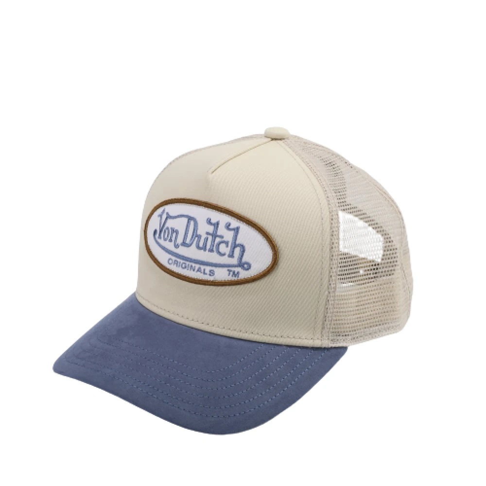 Trucker Boston fra Von Dutch. De ikoniske capsene fra Von Dutch er tilbake. Trucker Boston er en klassisk trucker caps med pustende mesh bak og stor, brodert logopatch i front. Capsen har beige netting, hvit brodert logo og beige stoff med lys blå brem, og regulerbar størrelse. – Von Dutch logopatch- Pustende mesh bak- Buet brem- Justerbart panel- One Size